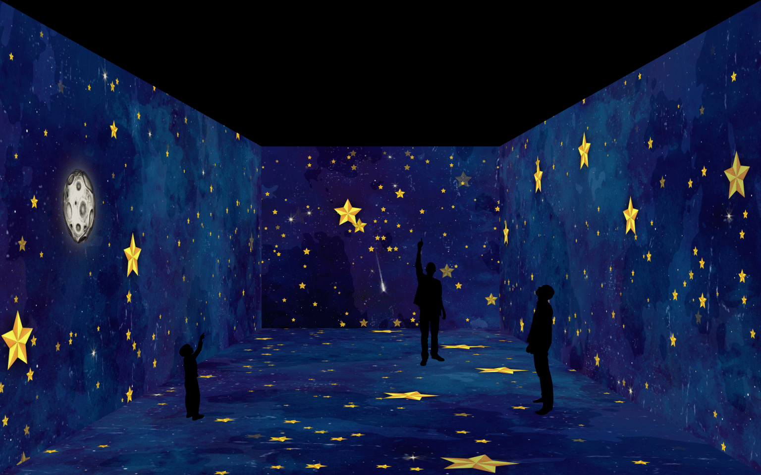 Im Mirror Room erwartet Besucher die immersive Installation „Stardust“, bei der die bekanntesten Sternbilder zum Leben erwachen, sich in funkelnde Fragmente verwandeln und sich im glitzernden Sternenstaub auflösen (by Alice Felloni).