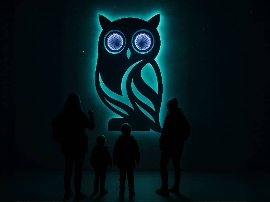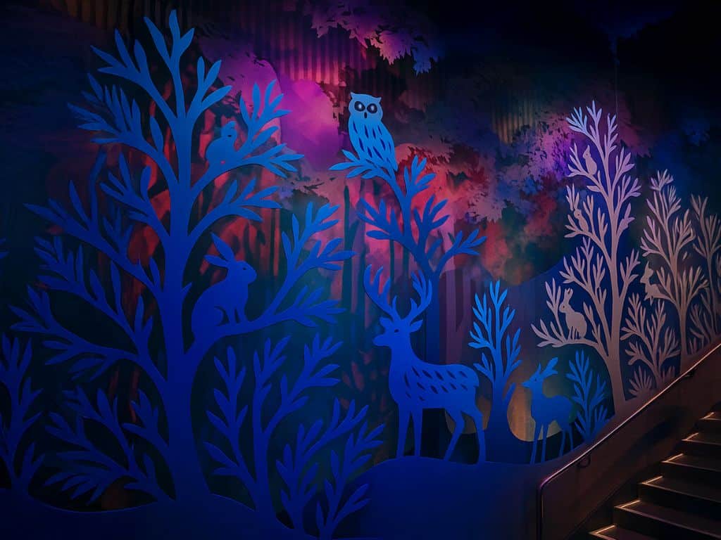 Tannen, Tiere und Traumfiguren erwachen in Turm 1 durch Licht und Projektionen zum Leben. Machen Sie sich auf die Suche nach der leuchtenden Eule, welche als „Hüterin der Träume“ durch die magischen Landschaft aus Licht und Klang schwebt (by Theresia & Alice Felloni).